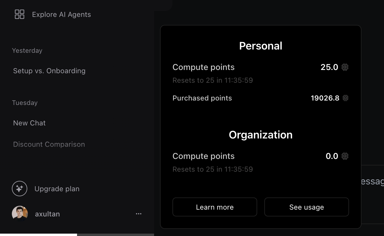 For Business or Enterprise customers, your company gets a pool of monthly credits. All users added to the organisation will consume credits from that pool. You can view them in the “Organisation” page.If a user has both organisational and personal credit allocations,